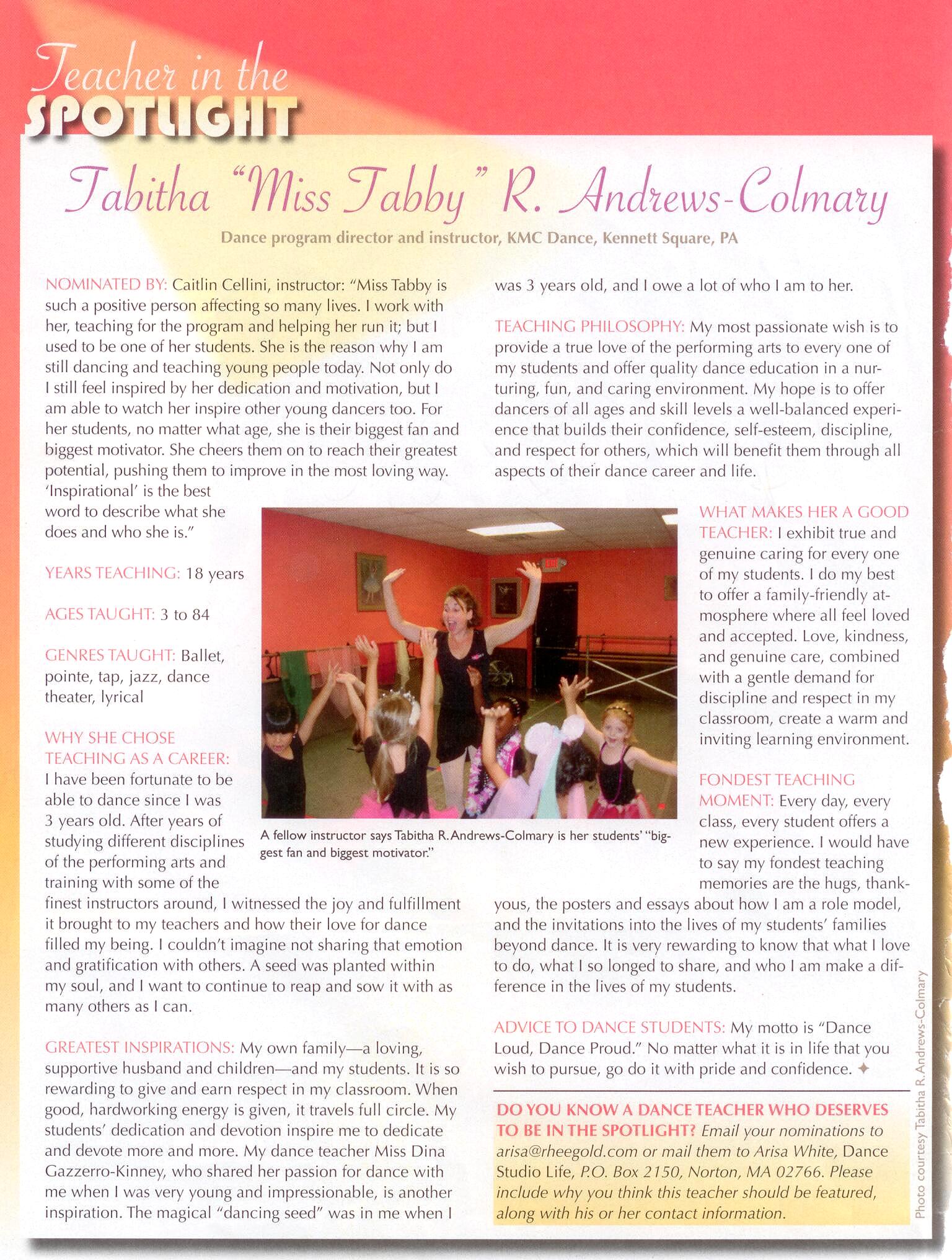 Tabitha R. Andrews-ColmaryTabitha R. Andrews-Colmary has committed much of her life to the world of the Performing Arts! Born and raised in Oxford, Pa., Tabitha began her dance training at the early age of three at the local dance studio of her hometown. She continued her dance education at various schools & academies throughout Delaware, Philadelphia, and the Baltimore areas. Her professional background includes performances, revues, and industrials on stages & venues all across the U.S.; from Hawaii, California, Tennessee, New York, New Jersey, and Pennsylvania. Tabitha’s diverse performance skills range from the most "Classical" Dance Forms to the "Showy Stage Productions" of Musical Theatre. Ms. Tabitha has been a performer/dance instructor/choreographer throughout the region for many years, and currently serves as the Dance Program Director for KMC DANCE in Kennett Square, PA. Over and beyond her own love to dance & perform is Tabitha’s love for teaching and sharing her passion with others! Dance Loud Dance Proud! Click to view larger |